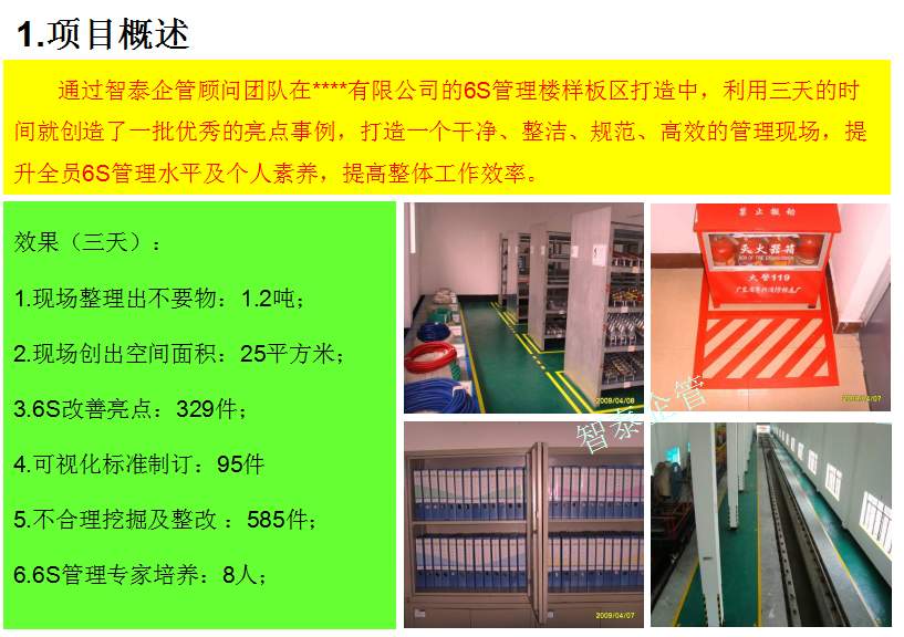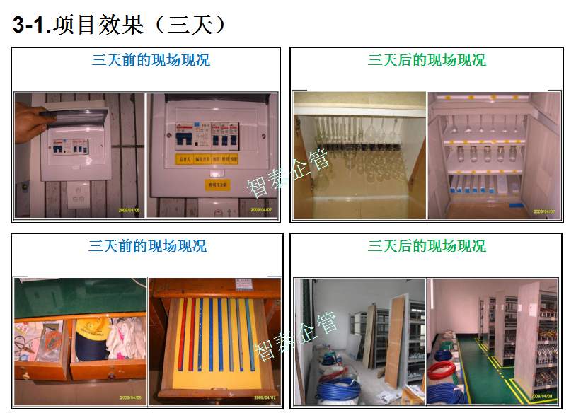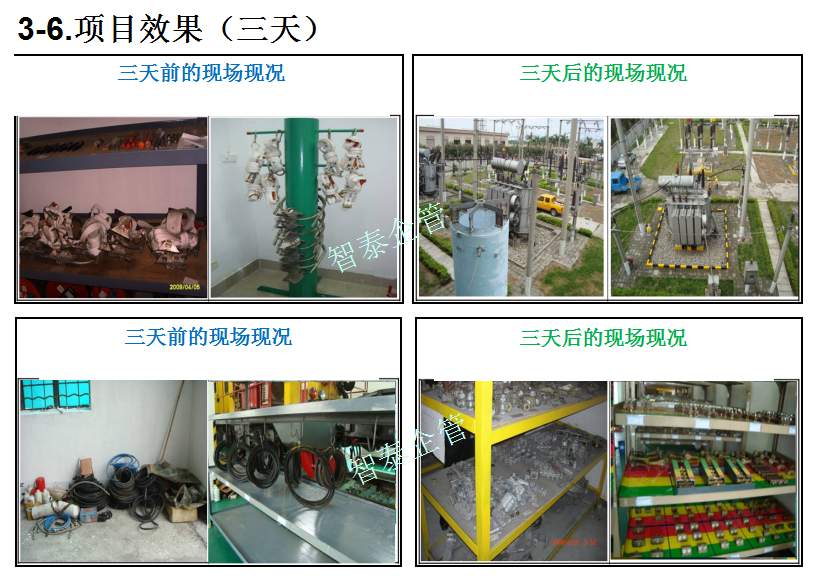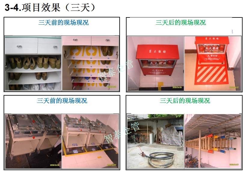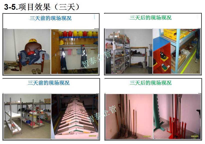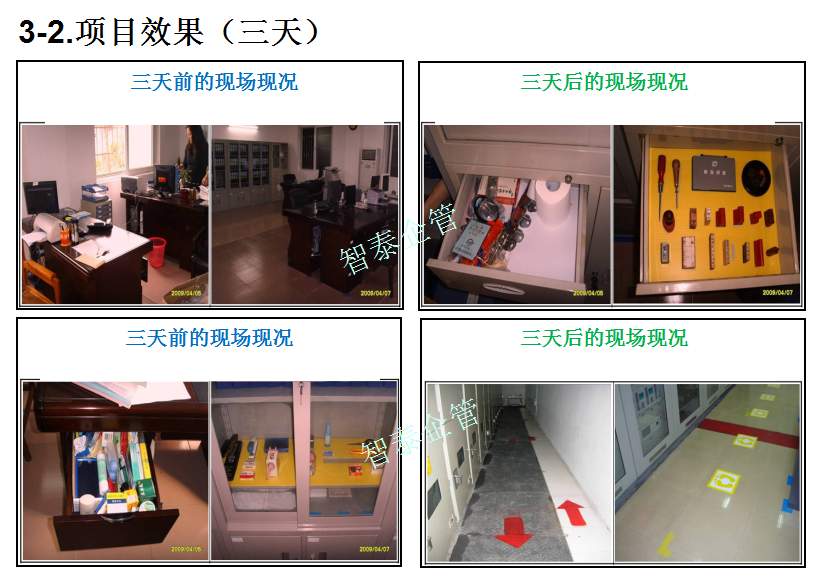 智泰咨詢下屬的5S管理公司首創(chuàng)的產(chǎn)品三天一標桿,三天一條線,三天締造6~8個標桿車間,智泰咨詢專業(yè)的顧問團隊為企業(yè)的5S管理快速打造已形成一套標準內(nèi)容,能夠快速在企業(yè)全面推進5S管理,附件為智泰咨詢?yōu)槟称髽I(yè)快速打造5S管理樣板區(qū)三天前后對比的現(xiàn)況,請查閱: