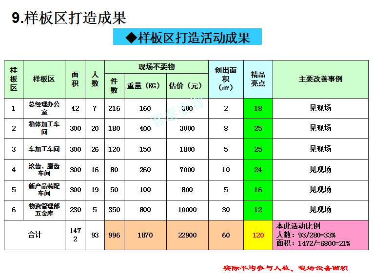 深圳智泰下屬6S咨詢公司在國內(nèi)對不同行業(yè)推進6S管理,98%以上取得非常滿意的效果,智泰專業(yè)團隊三天為企業(yè)打造成功6~8個標桿車間,6S咨詢公司快速為企業(yè)達成6S管理目標而努力奮斗,企業(yè)要想成為行業(yè)的標桿,必須持續(xù)推進現(xiàn)場管理,比如6S或TPM管理等,現(xiàn)場管理好的企業(yè)不一定是標桿企業(yè),但標桿企業(yè)的現(xiàn)場管理一定是優(yōu)秀的。附件為企業(yè)6S管理推進總結(jié)內(nèi)容,請查閱: