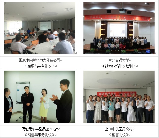曾為政府、電力、金融、汽車、通訊、建筑等多個領域企業(yè)/院校進行過禮儀形象課程培訓,培訓對象涵蓋政府政務人員、企事業(yè)單位新入職員工、教師隊伍、醫(yī)療行業(yè)、企業(yè)中層管理者、基層管理者和高層領導等各個層次,至今排課近300場,累計學員10000余人,學員好評率高達98%。