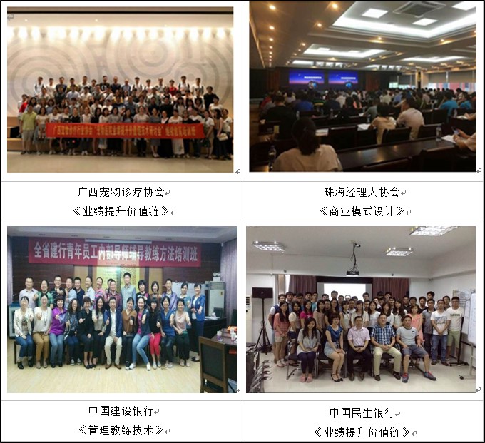 其中,廣東小白龍動(dòng)漫文化股份有限公司連續(xù)6年返聘《企業(yè)轉(zhuǎn)型與戰(zhàn)略規(guī)劃》、《商業(yè)模式設(shè)計(jì)》、《運(yùn)營(yíng)模式設(shè)計(jì)》、《營(yíng)銷模式創(chuàng)新》、《業(yè)績(jī)爆破——營(yíng)銷關(guān)鍵價(jià)值鏈技術(shù)》、《價(jià)值倍增——新商業(yè)模式創(chuàng)新》、《賦能式教練領(lǐng)導(dǎo)力》、《管理教練技術(shù)》、課程培訓(xùn)及教練輔導(dǎo),好評(píng)率極高,并聘請(qǐng)老師為公司營(yíng)銷總教練,助推企業(yè)連續(xù)6連取得年保持15%以上業(yè)績(jī)成長(zhǎng)并掛牌新三板的佳績(jī)。