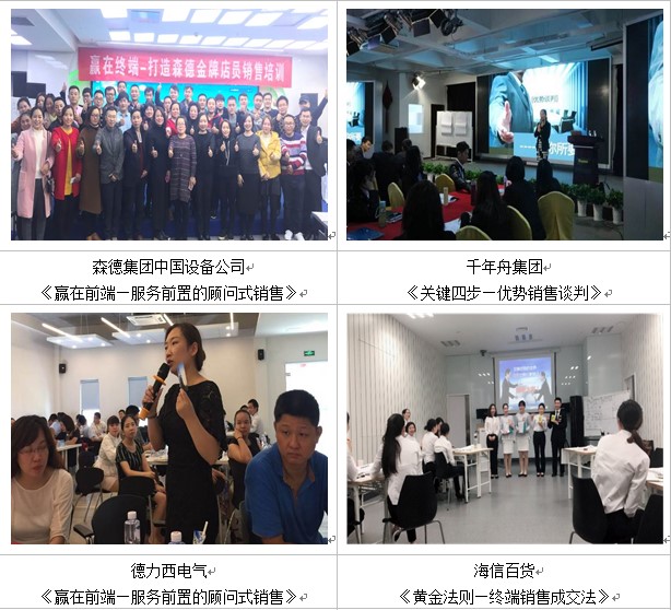 ★老師配合森德集團(tuán)中國設(shè)備公司分別在合肥、西安、沈陽、北京共講授6期《顧問式銷售—金牌訓(xùn)練營》,訓(xùn)練其經(jīng)銷商和其骨干人員近300余人,獲得企業(yè)內(nèi)外成員的高度認(rèn)可,并將課程納入到了森德訓(xùn)練體系教材。