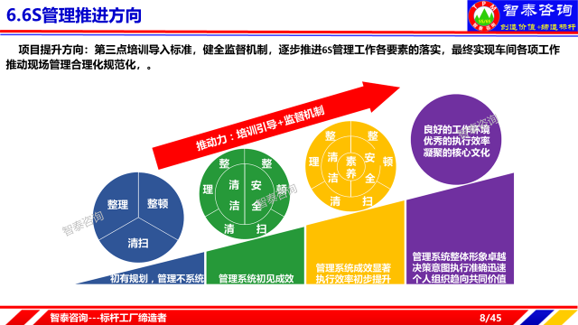 很多企業(yè)家或管理者對于推進(jìn)6S管理后,企業(yè)取得什么樣的作用或效果有疑問,由于不太了解6S管理的作用及目的,所以不積極主動去進(jìn)行這方面的推進(jìn),那么在這里在智泰咨詢公司與您
