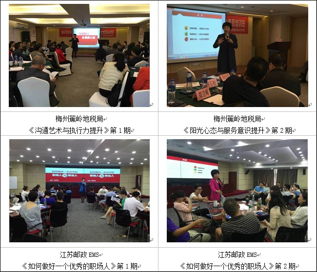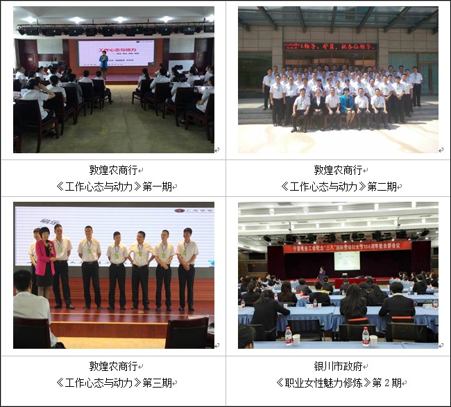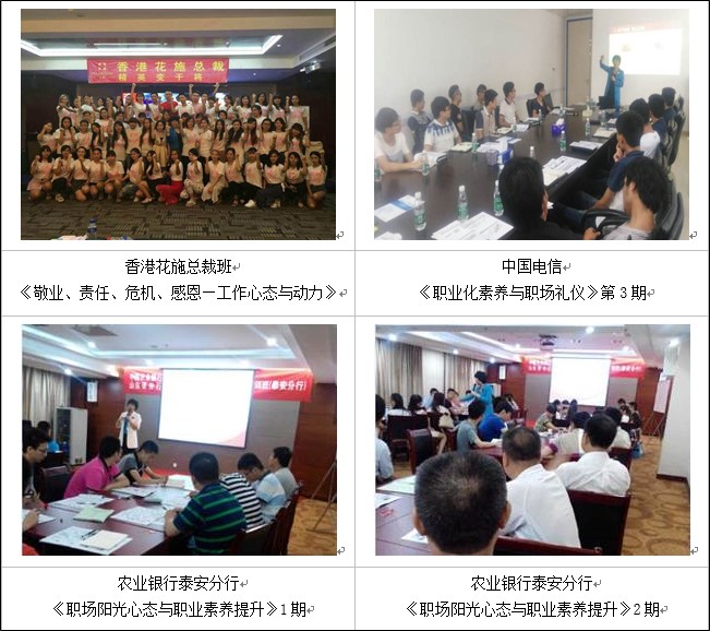 2012年至2014年為河南省郵政、山東省農(nóng)行、廣東省中行、浙江省建行、廣東省工行、廣東省農(nóng)信社、廣西農(nóng)信社進行《陽光心態(tài)與職業(yè)素養(yǎng)提升》、《正能量與責任》全省輪訓共110余期,學員滿意度都高達97%以上,返聘率高達85%。