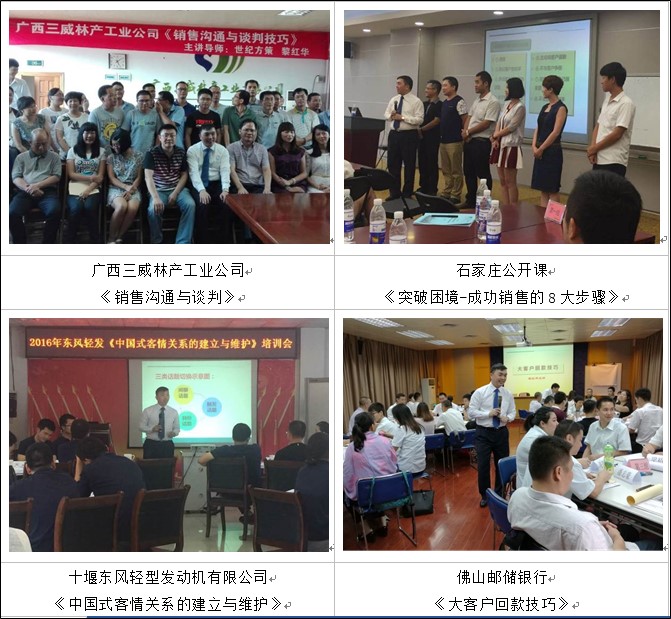 黎老師24年的營(yíng)銷管理和培訓(xùn)生涯,積累了豐富的企業(yè)管理實(shí)戰(zhàn)和顧問(wèn)經(jīng)驗(yàn),授課方式新穎獨(dú)特,重視與學(xué)員間的互動(dòng)、交流來(lái)啟發(fā)學(xué)員,使學(xué)員在視覺(jué)、聽(tīng)覺(jué)、觸覺(jué)、思維模式上形成多方位的感受,從而使之產(chǎn)生體驗(yàn);并將理論與實(shí)戰(zhàn)、認(rèn)知與實(shí)踐相結(jié)合,重視激發(fā)學(xué)員思維內(nèi)在視角,啟迪團(tuán)隊(duì)靈性及感悟智慧,其博取眾長(zhǎng),形象生動(dòng)的授課風(fēng)格,幽默和極富感染的表達(dá)力,營(yíng)造了一個(gè)個(gè)活潑有趣的培訓(xùn)課堂,充分激發(fā)了學(xué)員的潛能,使參訓(xùn)者的專業(yè)知識(shí)和技能在較短的培訓(xùn)時(shí)間內(nèi)得到了升華,深受客戶的歡迎和好評(píng)。
