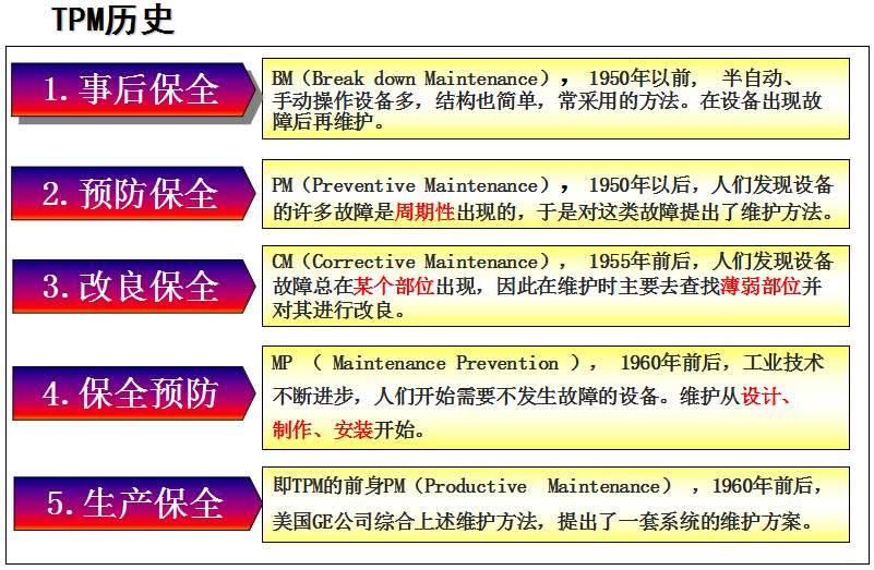 TPM咨詢公司中對(duì)于TPM管理的解釋是英文Total Productive Maintenance的縮略語(yǔ),中文譯名叫全員生產(chǎn)維護(hù),又譯為全員生產(chǎn)保全:《T (Total)全員 所有部門全員參加的意思;P (Productive)生產(chǎn) 效率提升追求故障 0 化, 不良 0 化, 災(zāi)害 0 化,浪費(fèi) 0 化;M (Maintenance)維護(hù)(保全) 追求極限效率為目的生產(chǎn)體系維持理想狀態(tài)的活動(dòng)》。這是日本人在70年代提出的,是一種全員參與的生產(chǎn)維護(hù)方式,其主要點(diǎn)就在“生產(chǎn)維護(hù)”及“全員參與”上。通過建立一個(gè)全系統(tǒng)員工參與的生產(chǎn)維護(hù)活動(dòng),使設(shè)備性能及員工綜合技能達(dá)到最優(yōu)。TPM咨詢管理的提出是建立在美國(guó)的生產(chǎn)維護(hù)體制的基礎(chǔ)上。在非日本國(guó)家,由于國(guó)情不同,對(duì)TPM的理解是:利用包括操作者在內(nèi)的生產(chǎn)維護(hù)活動(dòng),是以提高OEE(設(shè)備綜合效率)為目標(biāo),以全系統(tǒng)的預(yù)防維護(hù)為過程,全體人員參與為基礎(chǔ)的設(shè)備保養(yǎng)和維護(hù)管理體系。