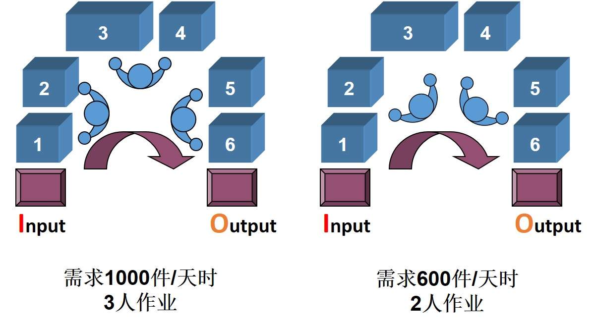在傳統(tǒng)生產(chǎn)方式中,工人通常只會(huì)操作一種設(shè)備。當(dāng)A設(shè)備的生產(chǎn)能力很強(qiáng)而B設(shè)備的生產(chǎn)能力較弱時(shí),很容易造成A設(shè)備的操作工人空閑而B設(shè)備的操作工人過(guò)于繁忙,從而導(dǎo)致生產(chǎn)不均衡。因此,“一個(gè)流”生產(chǎn)要求工人能夠操作多臺(tái)生產(chǎn)設(shè)備,通過(guò)培養(yǎng)多能工來(lái)均衡整個(gè)生產(chǎn)節(jié)拍。此外,培養(yǎng)多能工還有利于人員的增加或減少。