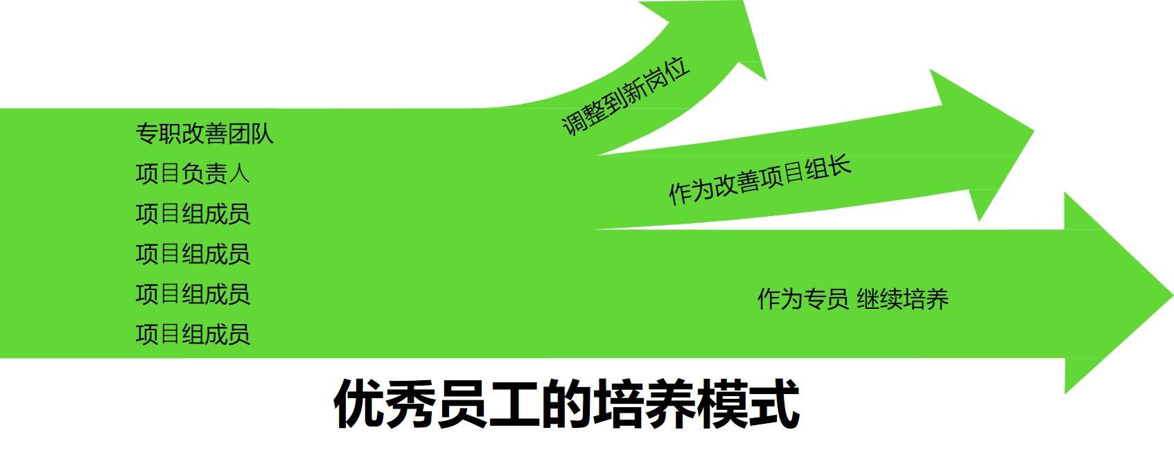 各分車間選撥專職人員,首先作為改善提案和核心人員或專員進行培養(yǎng),接受咨詢顧問和推進辦的指導,承擔部門內項目負責人或項目成員的角色,根據在項目中的表現(xiàn),調整到合適的新崗位或晉升(繼續(xù)專職或兼職改善工作)